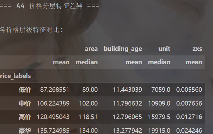 price_group = df.groupby('price_labels').agg({'area': ['mean', 'median'],'building_age': 'mean','unit': 'median','zxs': 'mean' # 直辖市占比