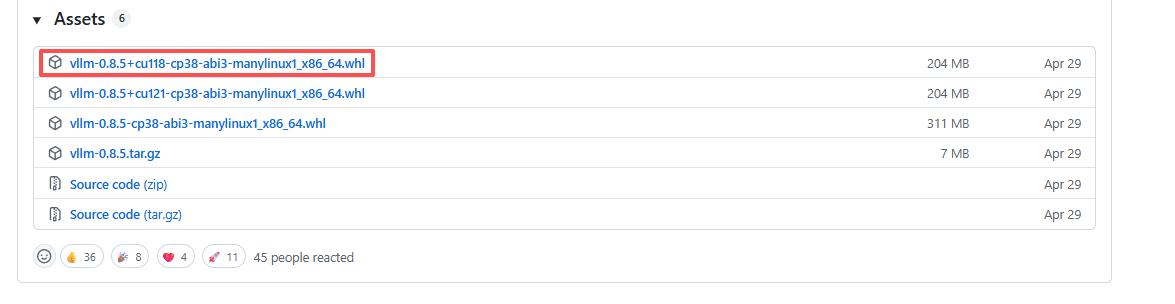 2.下载vllm-0.8.5+cu118-cp38-abi3-manylinux1_x86_64.whl,地址为:Release v0.8.5 · vllm-project/vllm。安装包在页面的最下边:
