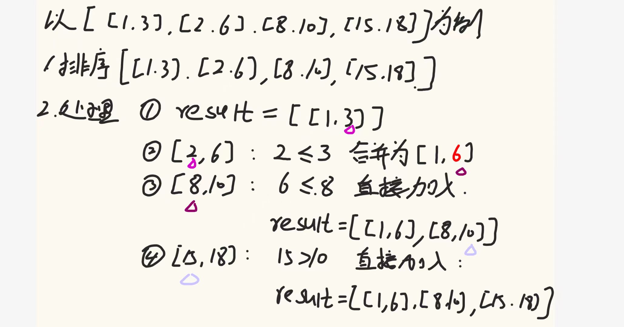 - 合并重叠区间:遍历排序后的区间,逐个判断是否与结果中最后一个区间有重叠;