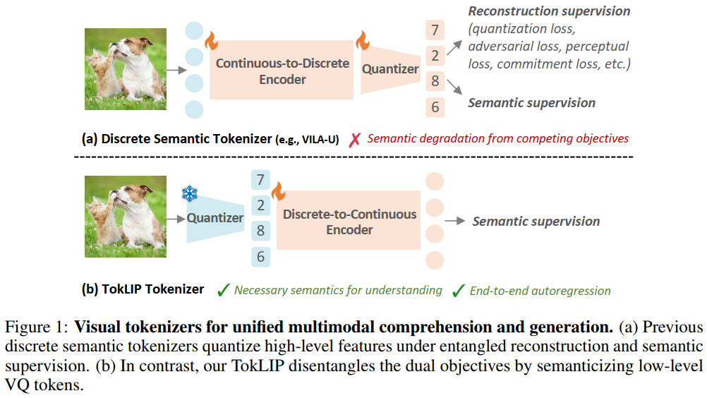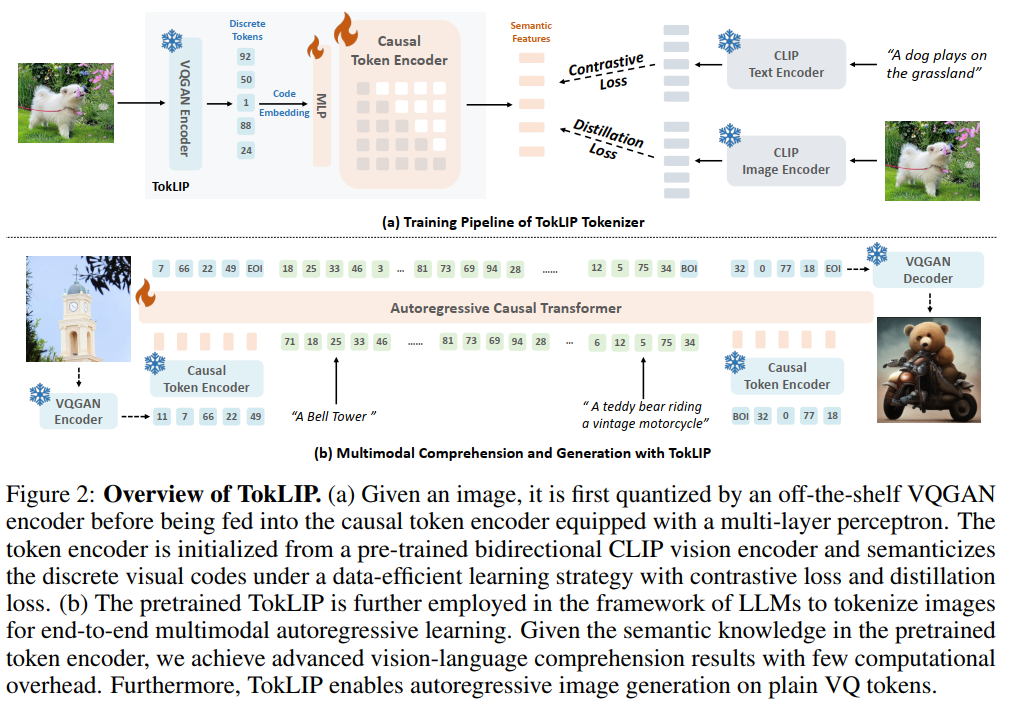 离散到连续的标记器架构: TokLIP提出了一种新颖的标记器范式:语义化低层VQ标记(如VQGAN输出),而不是离散化高层CLIP特征(如VILA-U)。它使用现成的VQ tokenizer捕获低层纹理信息,然后通过一个ViT-based因果标记编码器(初始化为CLIP权重)和MLP投影器,将离散标记映射到连续语义空间。这种设计解耦了理解(高层语义)和生成(低层细节)的目标,避免了量化信息损失和训练冲突,支持端到端的多模态自回归训练。