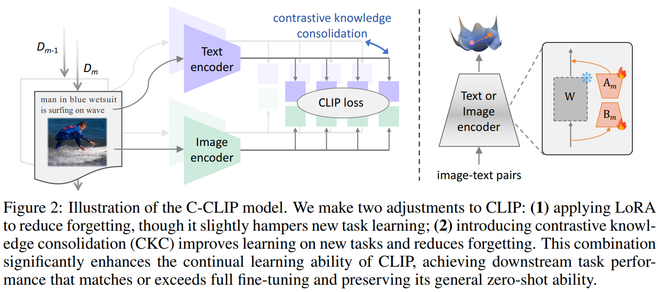 C-CLIP的核心研究目标是实现视觉-语言模型(如CLIP)在多个下游任务上的持续学习,即在适应新任务的同时,有效防止对旧任务的灾难性遗忘。其研究方法主要由两个核心组件构成: