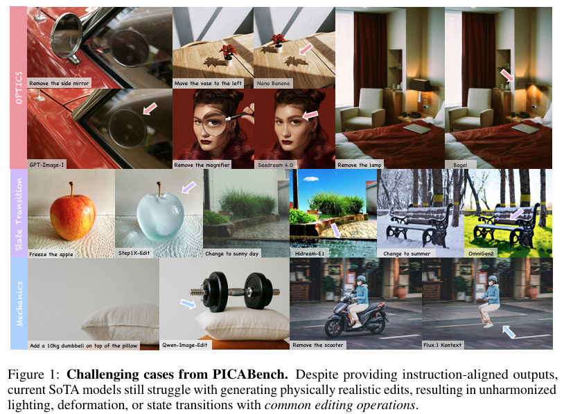然而,除了完成编辑指令外,伴随的物理效应是图像真实感的关键。例如,移除一个物体不仅应移除其阴影、反射以及与附近物体的交互,还需确保这些物理效应在编辑后的图像中保持一致。尽管现有的图像编辑模型和基准测试已经关注到了指令完成的重要性,但它们往往忽视了这些物理效应,导致生成的图像在物理一致性上存在缺陷。