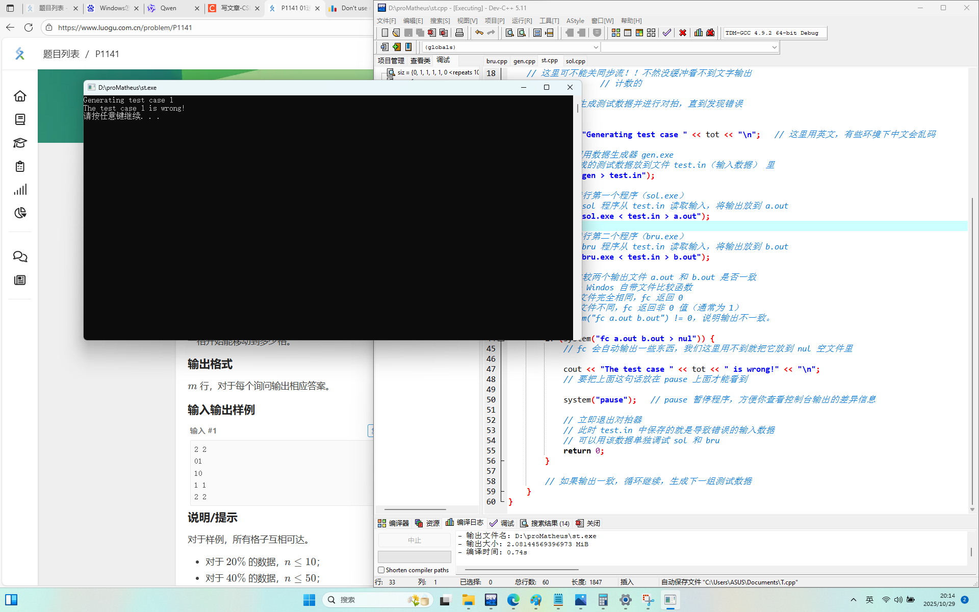 注意注意!!!这里要先把 gen.cpp 的数据生成范围改小,这样才方便调试!