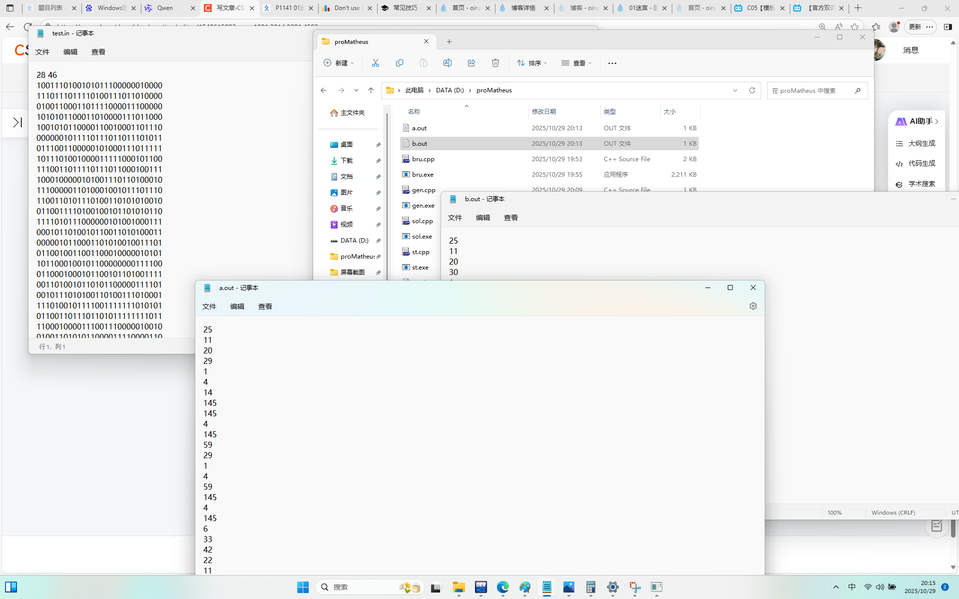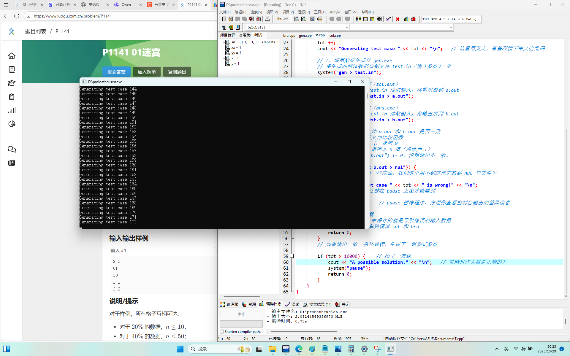 然后运行待测和暴力程序以及数据生成器,保存三个 exe 在上文的相同文件夹里。