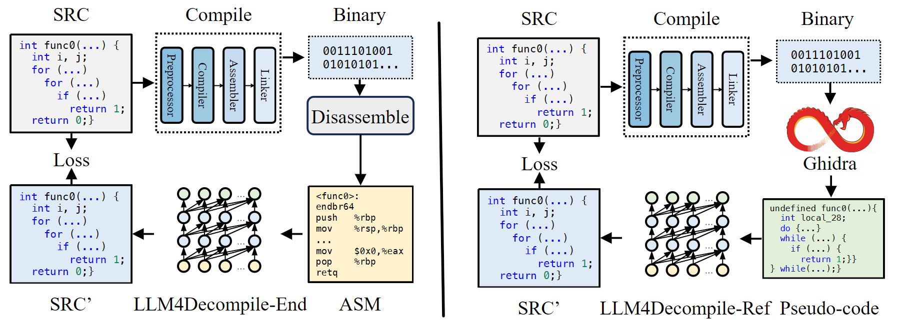 LLMs的最新进展显著改善了代码反编译流程。目前基于LLM的反编译主要存在两种方法——优化反编译(Refined-Decompile)和端到端反编译(End2end-Decompile)。其中,优化反编译通过提示LLM对传统反编译工具的输出结果进行优化修正。然而,由于LLM主要针对高级编程语言进行优化,其在处理二进制数据时可能效果欠佳。端到端反编译则通过微调LLM来实现直接对二进制文件进行反编译。但此前开源领域对该方法的应用受限于仅使用约2亿参数的小型模型和有限的训练语料库。相比之下,研究表明采用更庞大数据集训练的较大模型能显著提升性能表现。