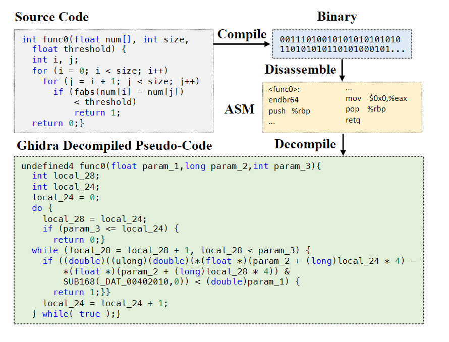 上图展示了从C语言源代码到二进制文件、汇编代码(ASM)以及Ghidra反编译伪代码的转换过程。该伪代码中,原有的嵌套for循环结构被替换为缺乏直观性的do-while循环嵌套while循环的组合形式。此外,类似num[i]的数组索引被反编译为复杂的指针运算表达式*(float *)(param_2 + (long)local_24 * 4)。反编译结果还存在语法错误,例如函数返回类型被转换为未定义类型undefined4。总体而言,传统反编译工具往往会丧失高级语言特有的语法明晰性,且无法保证语法正确性,即使对资深开发者而言也为其重构算法逻辑带来显著挑战。