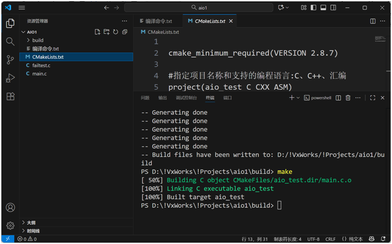 - 新建文件夹aio1,在VScode中打开该文件夹,新建3个文件:main.c、failtest.c、CMakeLists.txt。