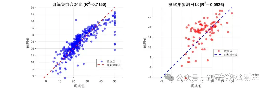 左图是训练集的散点图,右图是测试集的散点图。理想情况下,所有点都应该落在对角线上(预测值=真实值)。可以看到大部分点都分布在对角线附近,说明预测效果不错。