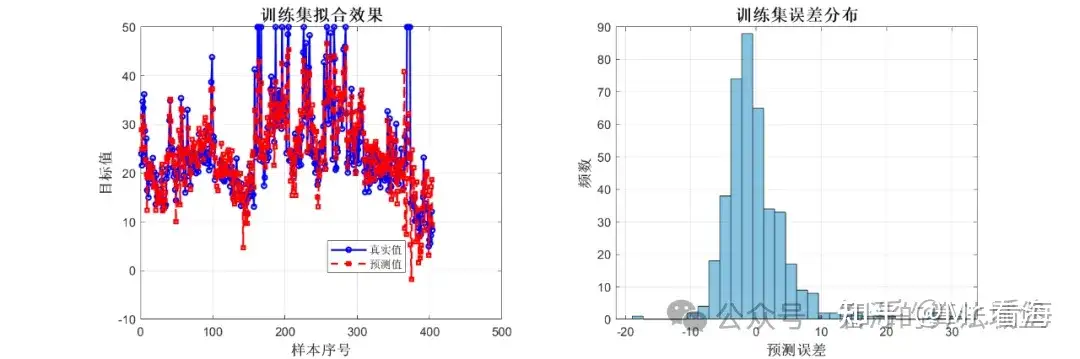 左图显示了训练集上真实值和预测值的对比曲线,可以看到两条曲线基本吻合。右图是训练集误差的分布直方图,误差主要集中在0附近,呈现正态分布。