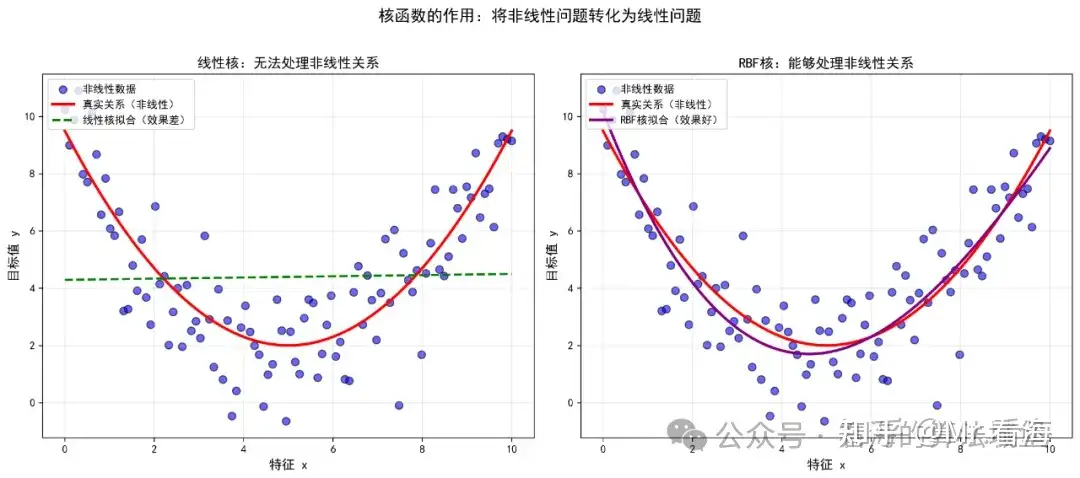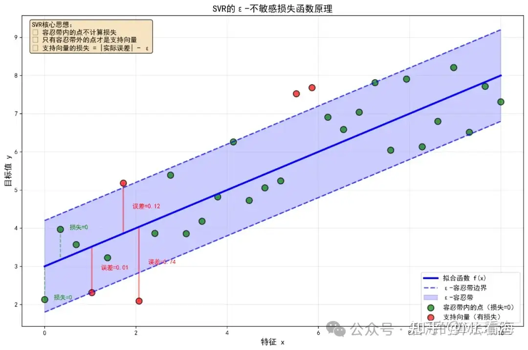 SVR回归的目标:找到一个拟合函数,使得大部分数据点都落在一个"容忍带"内。支持向量是那些落在容忍带外面的点,它们对模型有贡献。