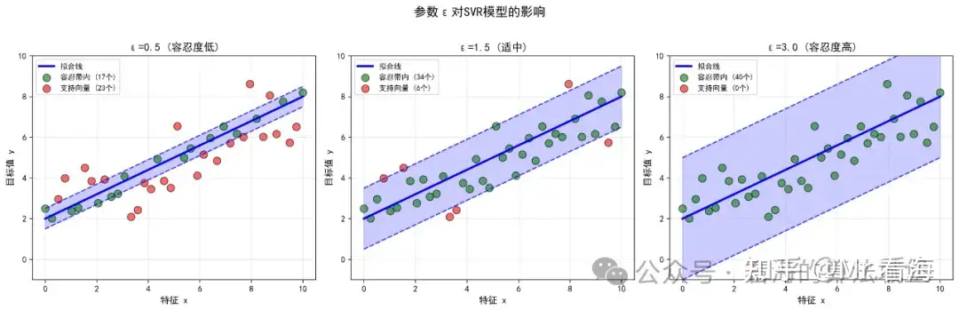 ε适中(如1.5):容忍带宽度合适,支持向量数量适中,模型性能最好。