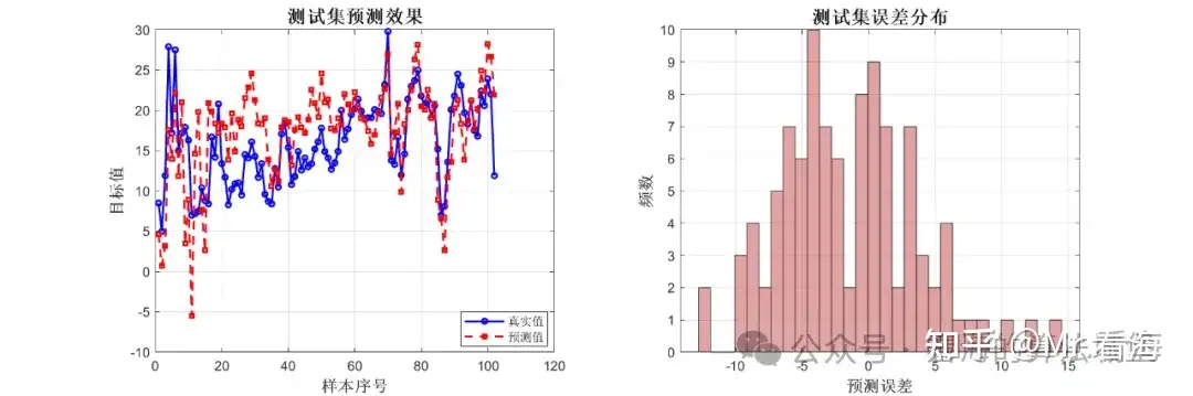左图显示了测试集上真实值和预测值的对比,右图是测试集误差分布。测试集的表现略差于训练集,但整体趋势一致,说明模型泛化能力良好。