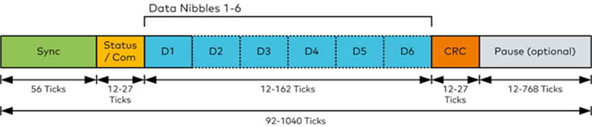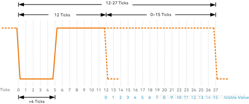 时间精度以1个节拍Tick来定义(一般1个Tick的时间是3~10us),每一个Nibble从一个下降沿开始,并且之后再逻辑0状态至少维持4Ticks,之后下一个下降沿距离第一个下降沿的时间差作为Nibble值的编码依据。需要注意的是,后一个下降沿距离第一个下降沿至少相隔12Ticks,至多27Ticks,且相隔Tick数减去12即为最终的Nibble值,如此Nibble值最小为0,最大为15(27Tick-12Tick),二进制表示时即为4bit。