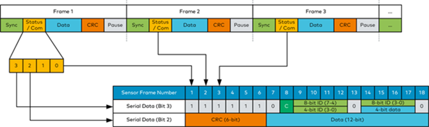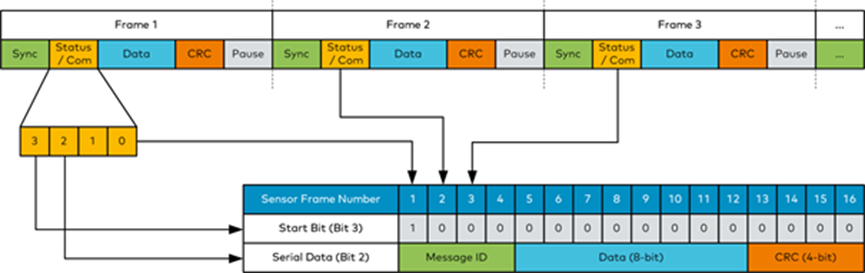 当Status/Com字段的bit3值为1,其之后的15帧SENT报文的Status/Com字段的bit3值都为0时,即为Short Serial Message,此情况下是16帧SENT报文组合来传输附加信息。