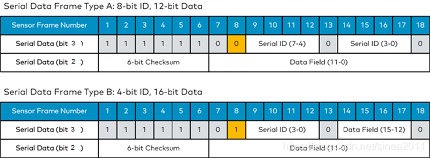 而数据域依然由18帧SENT报文的Status/Com字段的bit2值组合而成,但其数据组成又根据Status/Com字段bit3组合的第8位的不同分为2种情况: