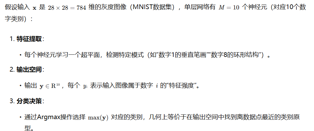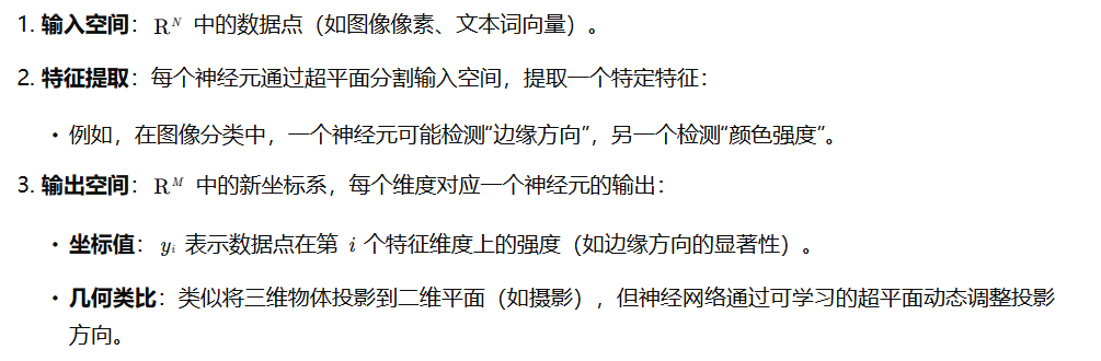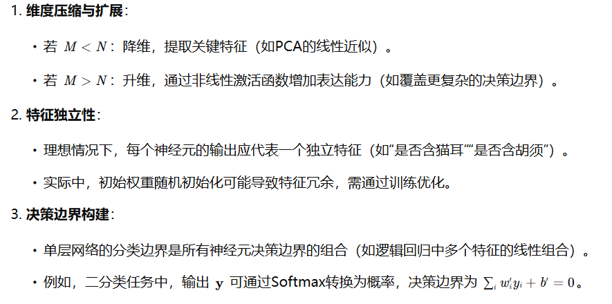 M个神经元组成的单层神经网络的本质:对N维向量空间的信息进行特征提取,并用这些提取出的特征重新构建了一个M维度的向量空间,每个神经元的代表在新的向量空间的一个维度,神经元的输出就是该神经元所在维度的坐标值。