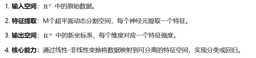 - 神经网络通过线性变换(全连接层)和激活函数将数据映射到新的向量空间,提取更高阶特征。