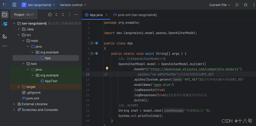 前提:创建一个阿里云百炼账号,获取密钥api_key并配置到系统环境中。在我的上一篇文章中有介绍:SpringBoot集成LangChain4j快速开发AI应用(调用阿里云Api)