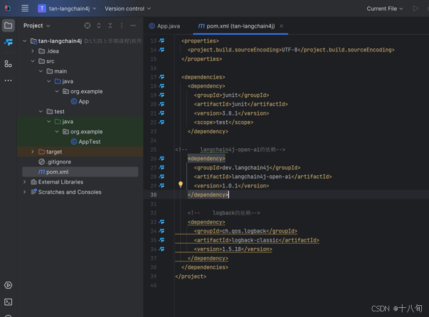<!-- langchain4j-open-ai的依赖--><dependency><groupId>dev.langchain4j</groupId><artifactId>langchain4j-open-ai</artifactId><version>1.0.1</version></dependency><!-- logback的依赖--><dependency><groupId>ch.qos.logback</groupId><artifactId>logback-classic</artifactId><version>1.5.18</version></dependency>