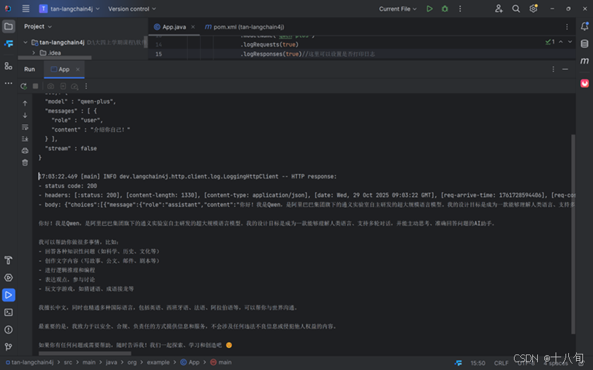 // .apiKey("sk-e893f54f8ae6")//直接设置你的API_KEY.apiKey(System.getenv("API_KEY"))//从环境变量中获取API_KEY.modelName("qwen-plus").logRequests(true).logResponses(true)//这里可以设置是否打印日志.build();//2、调用APIString chat = model.chat("介绍你自己!");System.out.println(chat);}