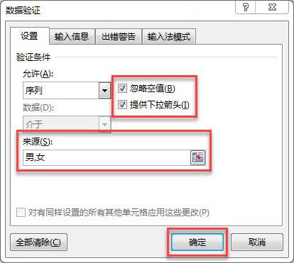方法一:在【来源(S)】下方文本框中键入选项内容,每个选项间用英文逗号隔开,设置完成后左键单击【确定】按钮。