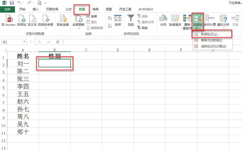 第二步:鼠标左键单击选中【B2】单元格,目的是在【B2】单元格处制作下拉菜单选项。左键单击菜单栏中的【数据】选项卡,左键单击【数据功能】功能区中的【数据验证】,左键单击选中【数据验证】下拉菜单中的【数据验证(V)】。