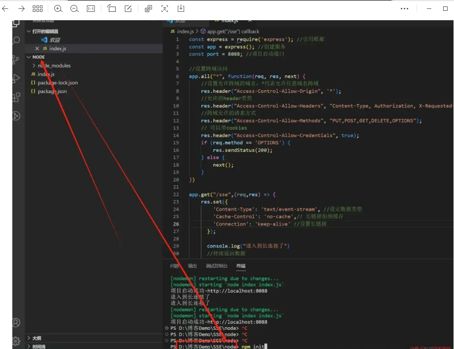 -  第二步,进入一个新的文件夹,建立一个index.js文件,然后将后端Demo代码复制进去,然后在该文件夹下执行