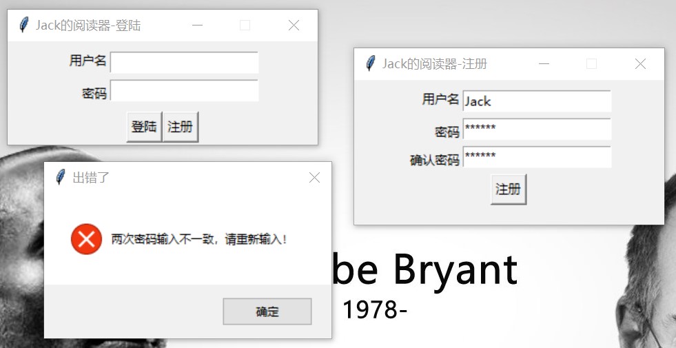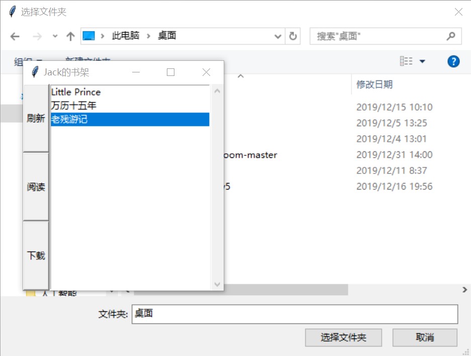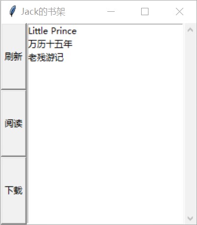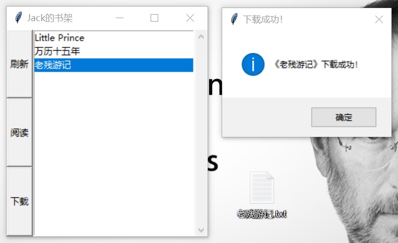 message = self.sc.recv_message() if message['type'] == MessageType.page_num:self.page_num = message['parameters'] print('《{}》书签位于第{}页'.format(self.bkname, message[' parameters'])) elif message['type'] == MessageType.no_book:                          messagebox.showerror('请求失败', '查无此书,请返回刷新书籍列表!') returnelse:print('未能成功接收到书签页数!错误:{}'.format(message['type'])) 		messagebox.showerror('请求失败', '未能成功接收到书签页数!错误:{}'.format(message['type'])) return二、运行展示
