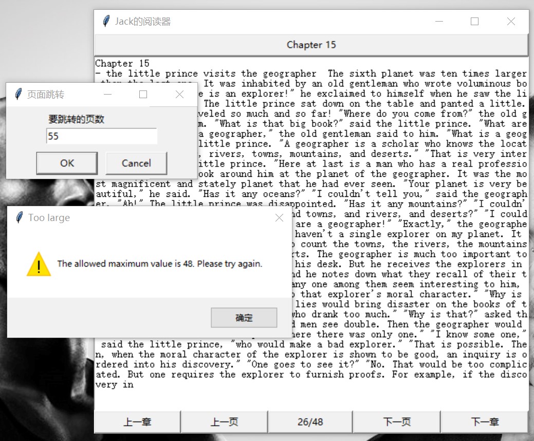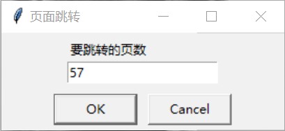 for i in range(len(bklist)):bklist[i] = bklist[i].strip('.txt')if bkname not in bklist: # 如果这本书不在书籍列表里sc.send_message(MessageType.no_book) return页面跳转超过界限:输入页面需要新的窗口,我使用了 Tkinter 库自带的简单对话框以输入页码,在其中可以方便的设置上下界,这里不再赘述。运行效果如图 9。