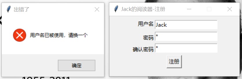 本程序设计了一些错误处理机制以应对例外情况,大部分例外情况会通过弹窗通知用户。对本小说阅读器来说,由于功能相对简单,可能发生错误的地方主要在于(I)登陆和注册(II)客户端书架(书籍列表)界面内容与服务器不匹配(III)页面跳转时超过了上下界限(IV)服务器发生了其他错误,对此我分别写了相应的错误处理机制。