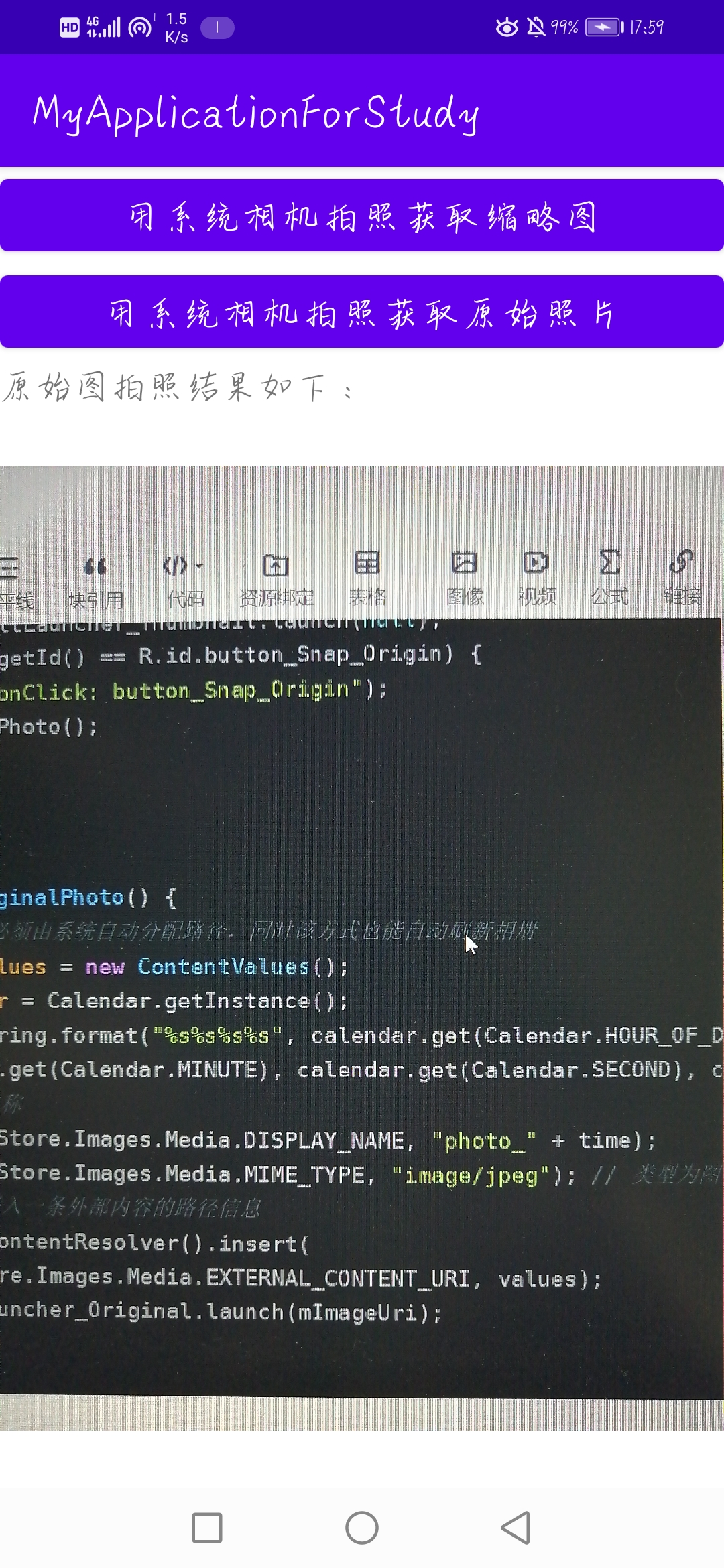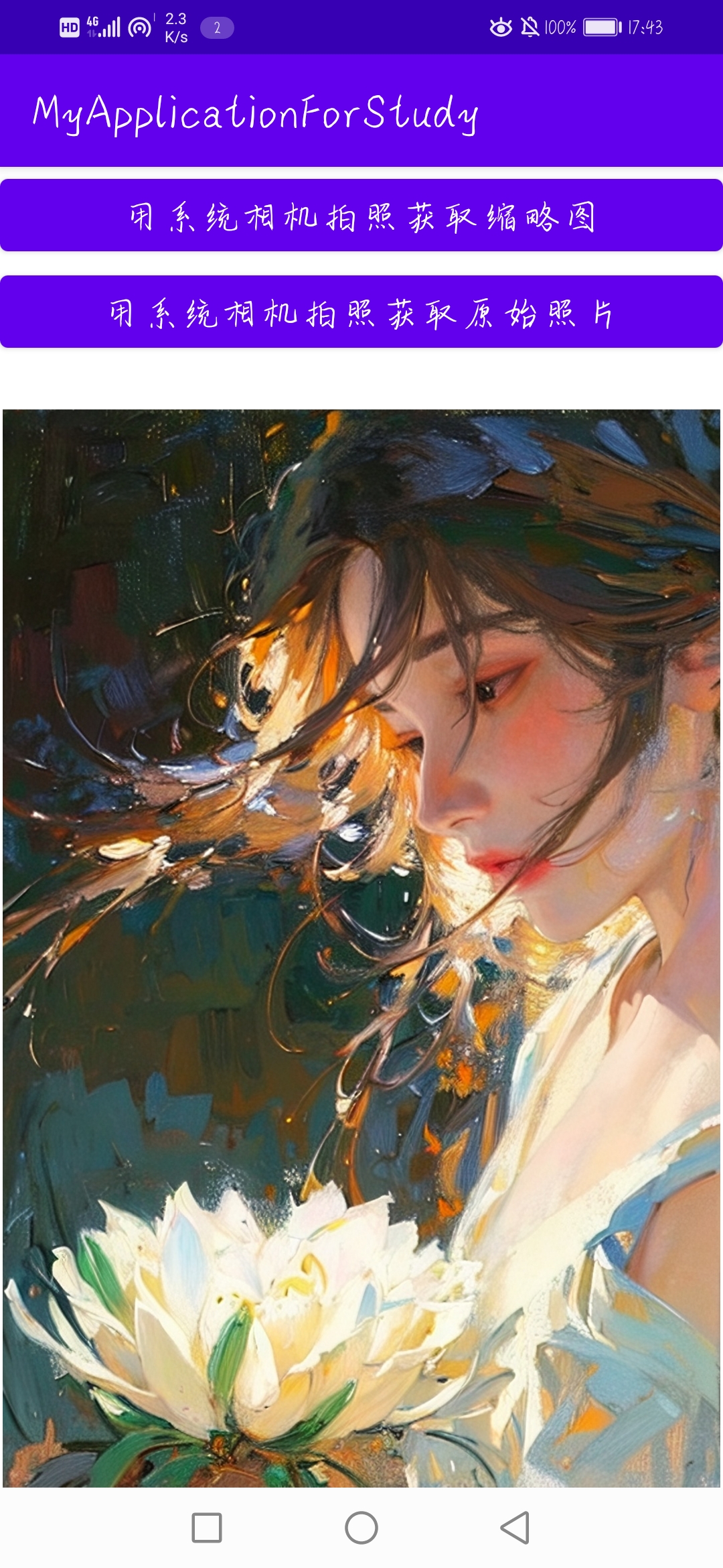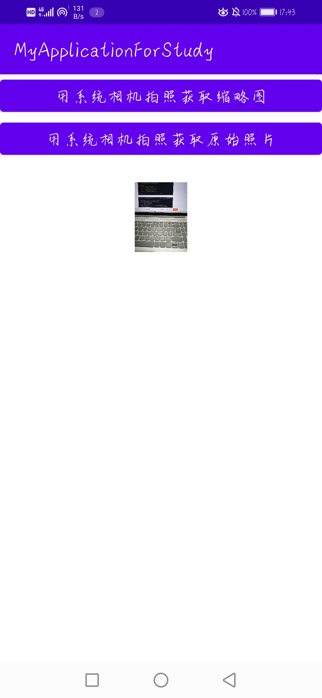 <LinearLayout xmlns:android="http://schemas.android.com/apk/res/android"xmlns:app="http://schemas.android.com/apk/res-auto"xmlns:tools="http://schemas.android.com/tools"android:layout_width="match_parent"android:layout_height="match_parent"tools:context=".MultiMedia.SnapBySystemCameraActivity"android:orientation="vertical"><Buttonandroid:id="@+id/button_Snap"android:layout_width="match_parent"android:layout_height="wrap_content"android:text="用系统相机拍照获取缩略图"/><Buttonandroid:id="@+id/button_Snap_Origin"android:layout_width="match_parent"android:layout_height="wrap_content"android:text="用系统相机拍照获取原始照片"/><TextViewandroid:id="@+id/textView"android:layout_width="match_parent"android:layout_height="wrap_content"/><ImageViewandroid:id="@+id/imageView"android:layout_width="match_parent"android:layout_height="wrap_content"android:layout_gravity="center"android:src="@drawable/image_1" /></LinearLayout>部分Java代码如下,主要看两个活动结果启动器的内容以及方法takeOriginalPhoto的内容,第一个启动器返回的是一个Bitmap类型的数据,可以直接将Bitmap赋给ImageView;第二个启动器返回的是一个布尔类型,表示是否拍照成功,若成功则可以通过在takeOriginalPhoto方法中获取的Uri来打开已保存的图片并将其转化为Bitmap类型赋给ImageView,示例代码中的图片保存在系统相册中,可以在系统相册中找到拍摄的照片。如果只是需要简单的图片那么第一种方式已经足够了,代码量少且简单实现。