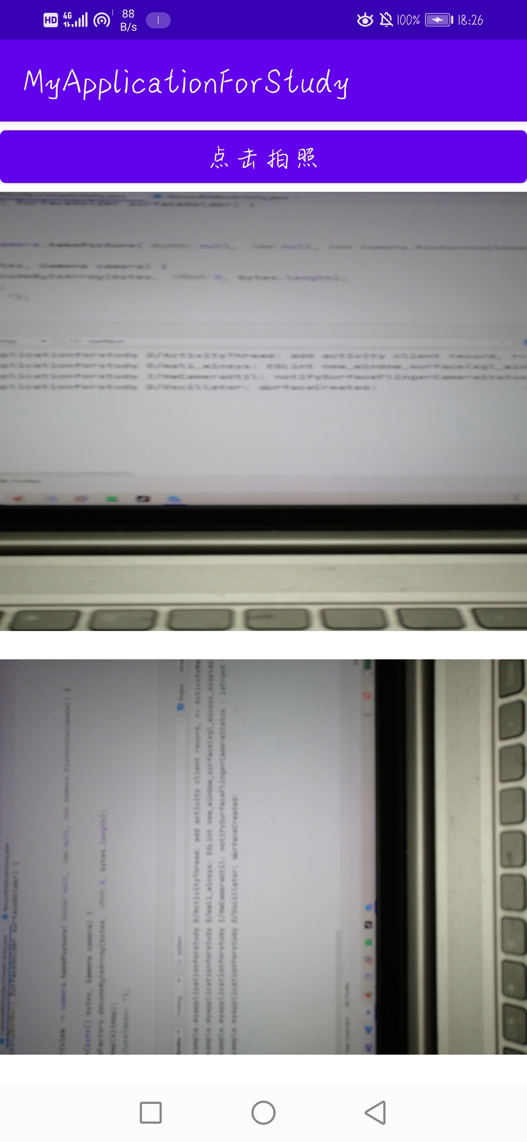 public class CameraWithSurfaceViewActivity extends AppCompatActivity {private SurfaceView surfaceView;private Button button_Snap;private ImageView imageView;private SurfaceHolder surfaceHolder;private Camera camera;@Overrideprotected void onCreate(Bundle savedInstanceState) {super.onCreate(savedInstanceState);setContentView(R.layout.activity_camera_with_surface_view);initView();}private void initView() {button_Snap = findViewById(R.id.button_Snap);imageView = findViewById(R.id.imageView);surfaceView = findViewById(R.id.surfaceView);surfaceHolder = surfaceView.getHolder();surfaceHolder.addCallback(new SurfaceHolder.Callback() {@Overridepublic void surfaceCreated(@NonNull SurfaceHolder surfaceHolder) {initCamera();}@Overridepublic void surfaceChanged(@NonNull SurfaceHolder surfaceHolder, int i, int i1, int i2) {}@Overridepublic void surfaceDestroyed(@NonNull SurfaceHolder surfaceHolder) {}});button_Snap.setOnClickListener(view -> camera.takePicture(null, null, new Camera.PictureCallback() {@Overridepublic void onPictureTaken(byte[] bytes, Camera camera) {Bitmap bitmap = BitmapFactory.decodeByteArray(bytes, 0, bytes.length);imageView.setImageBitmap(bitmap);}}));}private void initCamera() {// 初始化 Camera,0 通常代表后置摄像头camera = Camera.open(0);// 调整摄像头预览角度,例如设置为90度camera.setDisplayOrientation(90);// 设置SurfaceView不维护自己的缓冲区surfaceHolder.setType(SurfaceHolder.SURFACE_TYPE_PUSH_BUFFERS);// 将Camera的预览输出与SurfaceView关联try {camera.setPreviewDisplay(surfaceHolder);} catch (IOException e) {Log.d(TAG, "initializeCamera: " + e.getMessage());}camera.startPreview(); // 开始预览}}效果图如下,图片中第一个图片为SurfaceView,第二个为ImageView。