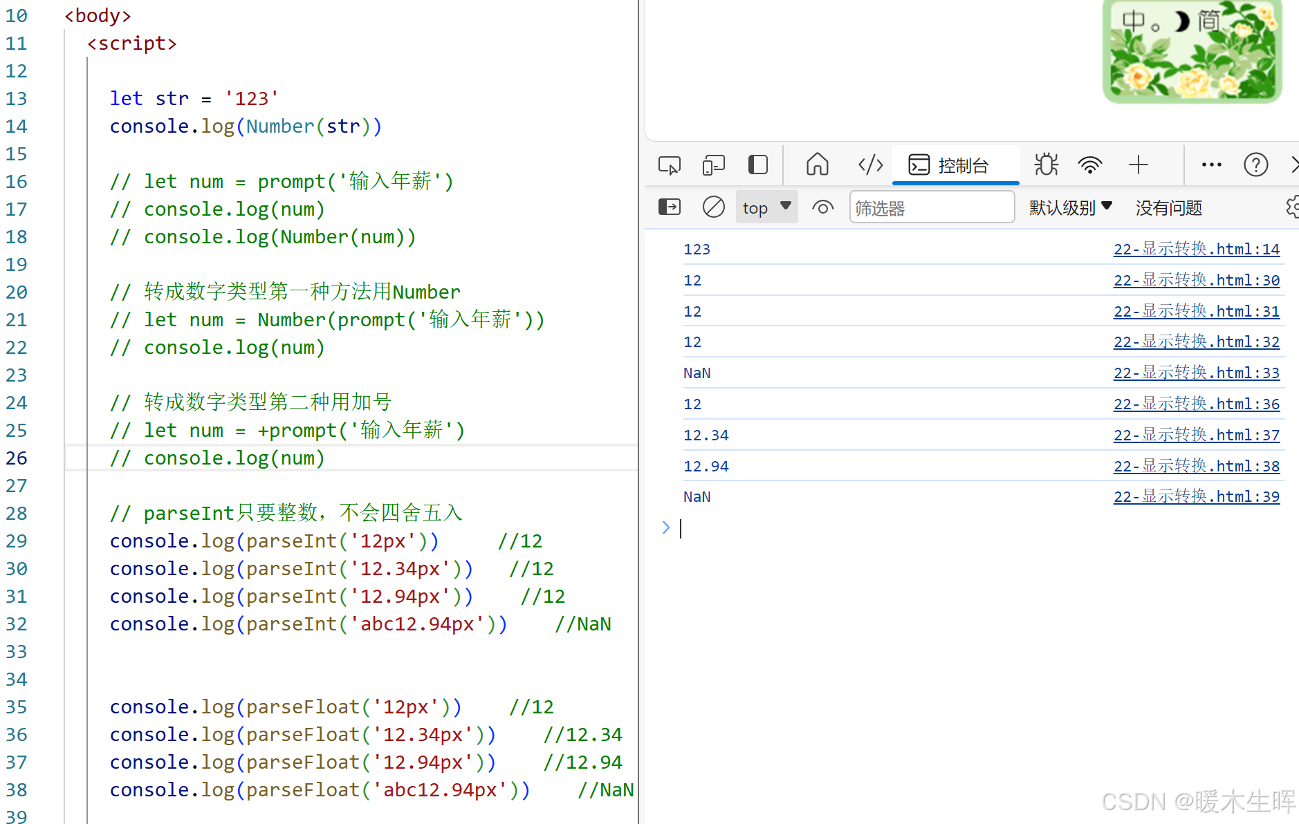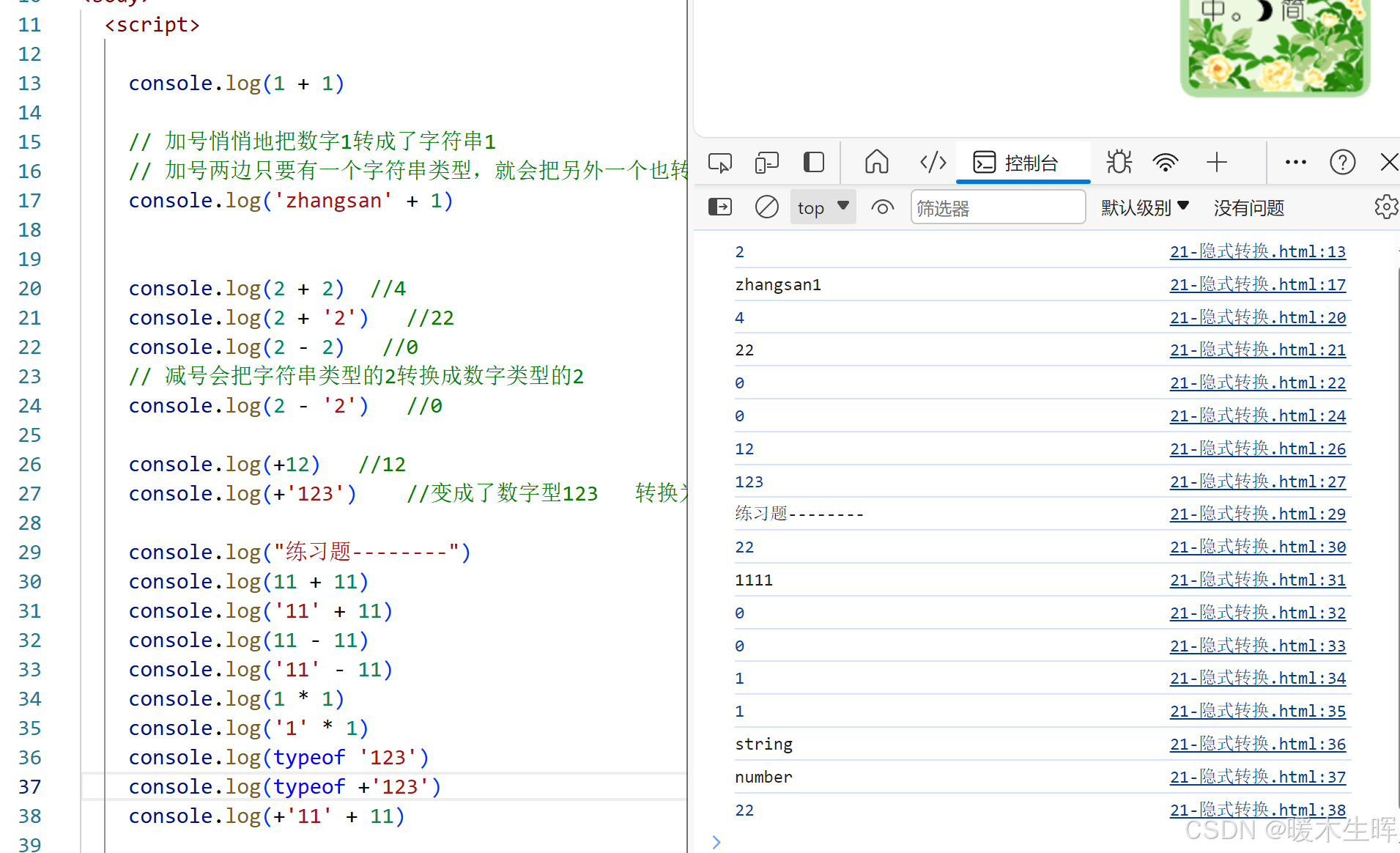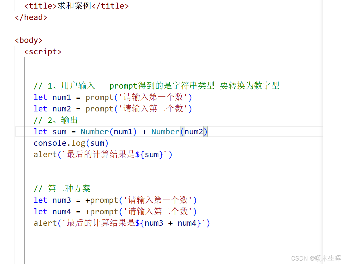 注:使用表单、prompt获取过来的数据默认是字符串类型的,此时就不能直接简单的进行加法运算。在操作之前需要检测一下数据类型,再进行转换。