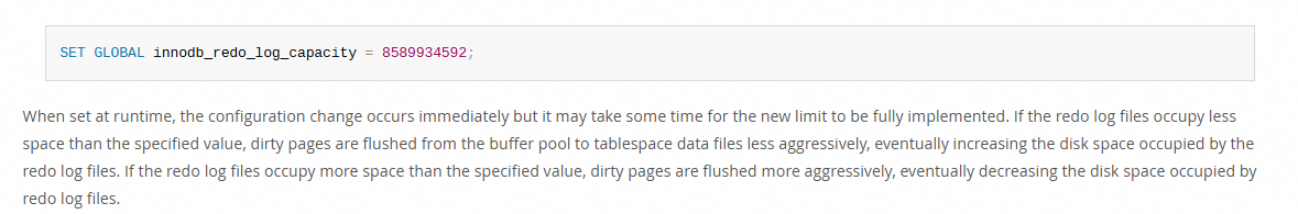 在运行时设置时,配置更改会立即发生,但可能需要一些时间才能完全实现新的限制。如果重做日志文件占用的空间小于指定值,则脏页将从缓冲池中较不积极地刷新到表空间数据文件中,最终增加重做日志文件所占用的磁盘空间。如果重做日志文件占用的空间超过指定值,则会更积极地刷新脏页,最终减少重做日志文件所占用的磁盘空间。