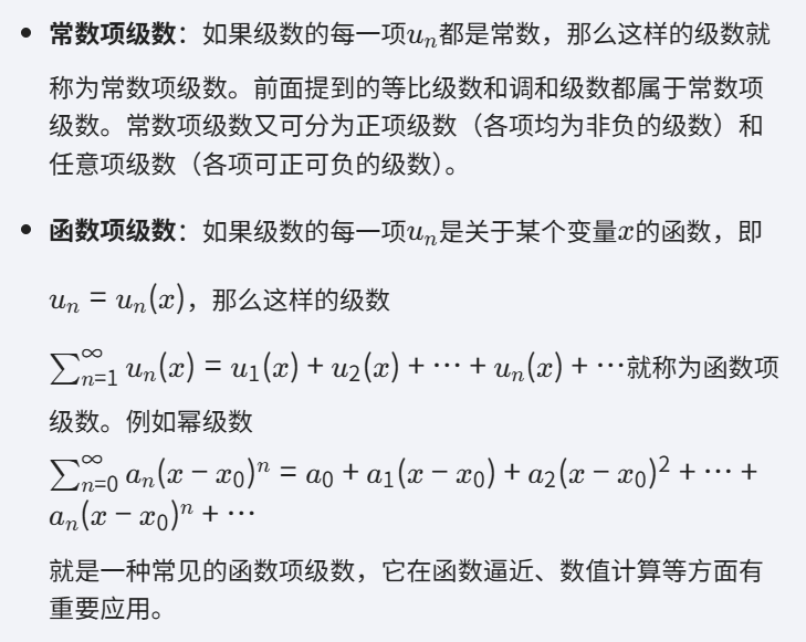 无穷级数是数学分析中的一个重要概念,它在数学的许多领域以及物理、工程等学科中都有广泛的应用。下面为你详细介绍无穷级数: 定义 无穷级数是对无穷多个数相加的一种数学表示。 级数的部分和 级数的收敛与发散 级数的分类