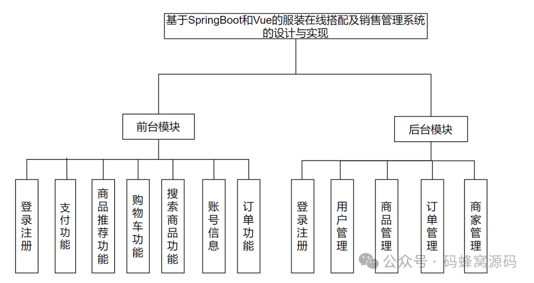 服装在线搭配及销售管理系统包括用户注册和登录、商家管理、商品管理、商品分类管理、在线下单、在线支付、订单管理、物流跟踪等模块。整个系统的功能模块设计如图 :