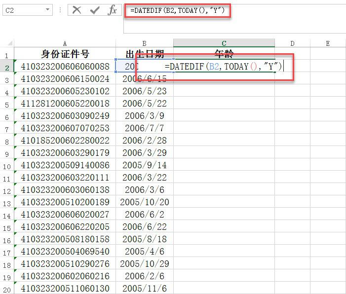 第六步:在【C2】单元格中键入函数【=DATEDIF(B2,TODAY(),"Y")】后,按回车键进行运算。