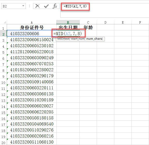 第二步:在【B2】单元格中键入函数【=MID(A2,7,8)】后,按回车键进行运算。