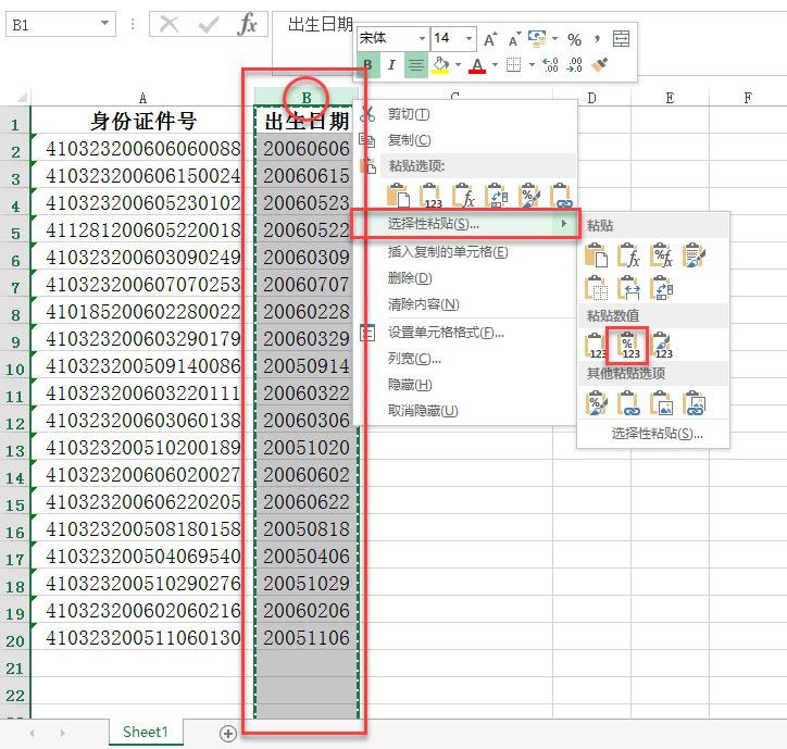 第四步:左键单击【B】选中整列后,同时按下键盘上的【Ctrl + C】键复制【B】列。右键单击【B】列,将鼠标指针移动至右键菜单中的【选择性粘贴(S)】,左键单击选中【粘贴数值】中的【值和数字格式(A)】,图标如图所示。