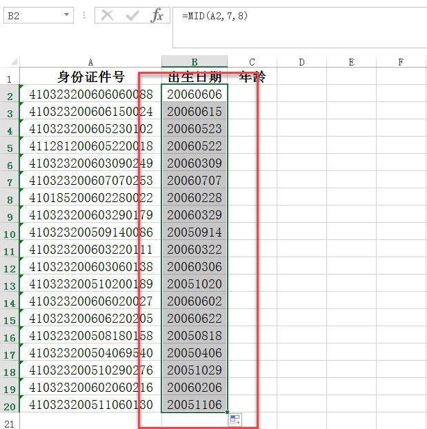 第五步:将【B】列中的八位出生日期设置为日期格式。详情点击关注后请参考《Microsoft Excel怎么将八位数字设置为日期格式?》。