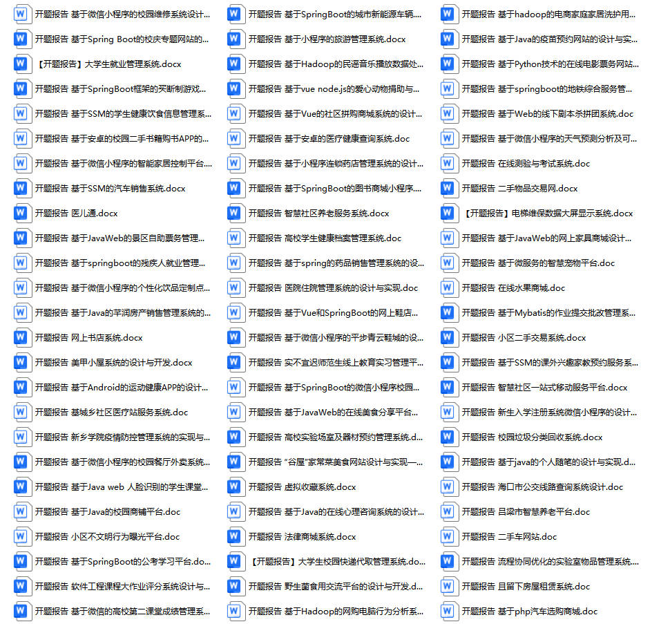 以上是某同学的毕业设计答辩的过程,如果你现在还没有参加答辩,还是开题阶段,已经选好了题目不知道怎么写开题报告,可以下面找找有没有自己符合自己题目的开题报告内容,列表中的开题报告都是往届真实的开题报告,可发送使用或参考。文末或底部来联xi可免费获取