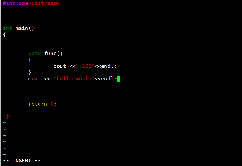 打开vim,默认我们处在命令模式,此模式下输入的所有东西都会被视作命令,有的同学第一次打开vim直接开始写代码却没有反应的原因也是如此。