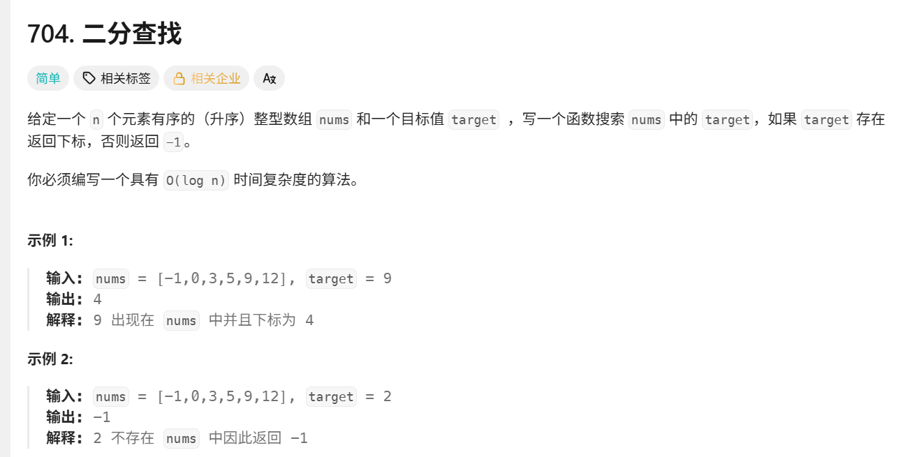 public:int search(vector<int>& nums, int target) {int left = 0;int right = nums.size() - 1;while(left <= right){int mid = left + (right - left)/2;if(nums[mid] > target){right = mid-1;}else if(nums[mid] < target){left = mid+1;}else{return mid;}}return -1;}