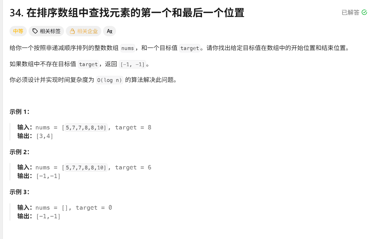 public:vector<int> searchRange(vector<int>& nums, int target) {if(nums.size() == 0){return {-1,-1};}   int begin = 0;int left = 0;int right = nums.size() - 1;while(left < right){int mid = left + (right - left) /2;if(nums[mid] < target){left = mid + 1;}else{right = mid;}}if(nums[left] != target){return {-1,-1};}else{begin = left;}left = 0;right = nums.size() - 1;while(left < right){int mid = left + (right - left + 1)/2;if(nums[mid] > target){right = mid - 1;}else{left = mid;}}return {begin,right};}