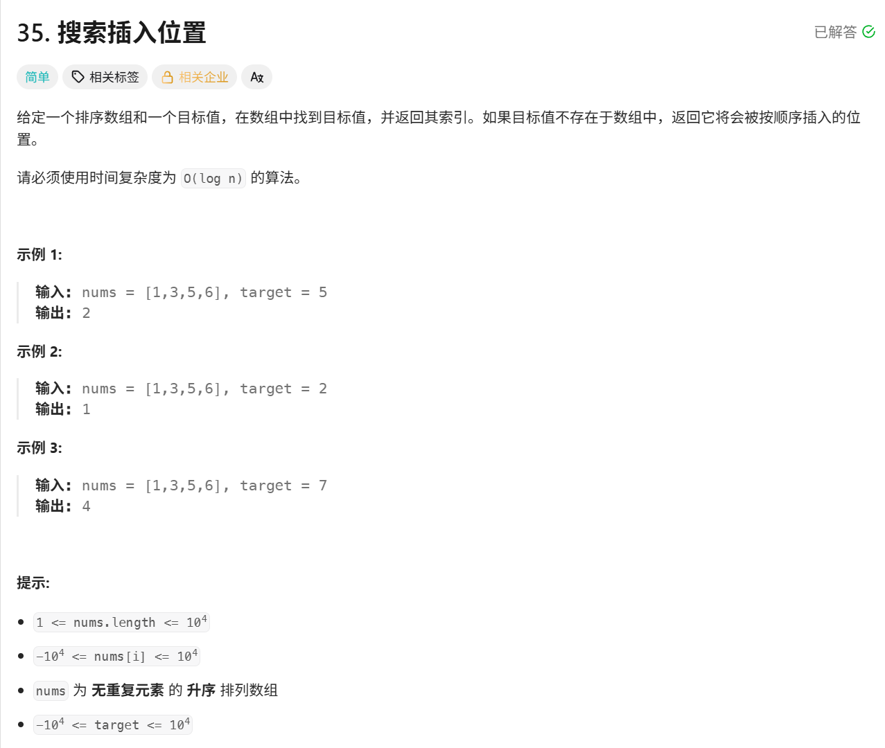 public:int searchInsert(vector<int>& nums, int target) {int left = 0;int right = nums.size() - 1;while(left < right){int mid = left + (right - left)/2;if(nums[mid] < target){left = mid + 1;}else{right = mid;}}if(nums[left] < target){return right + 1;}return right;}