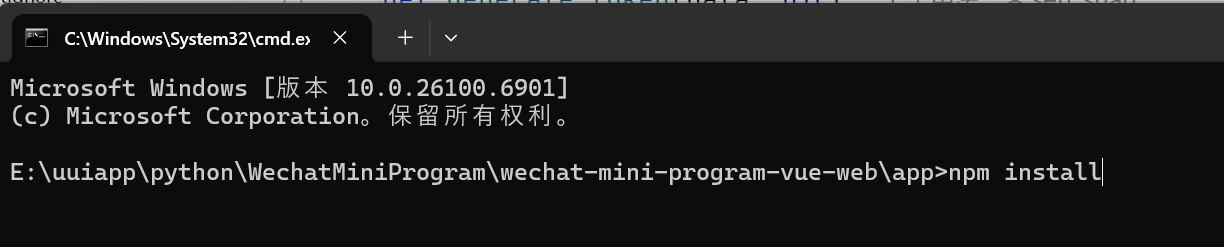 打开命令提示符,进入 wechat-mini-program-vue-web\app 目录后执行 npm install 。