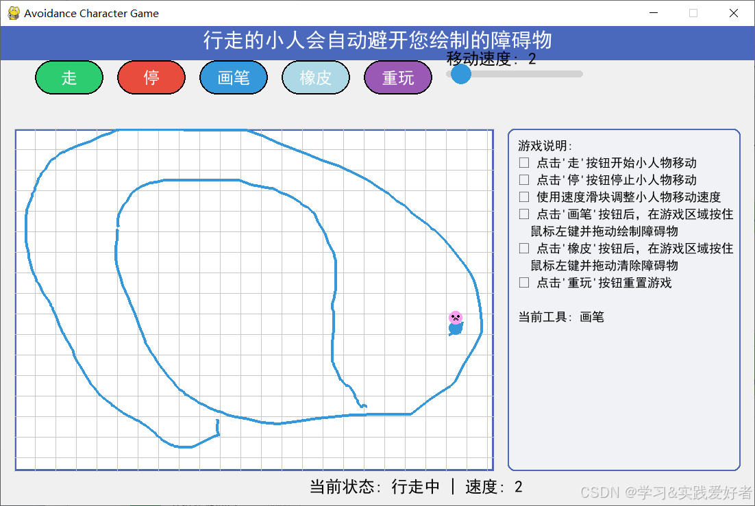 while running:mouse_pos = pygame.mouse.get_pos()for event in pygame.event.get():if event.type == pygame.QUIT:running = False# 处理按钮点击for button in buttons:button.check_hover(mouse_pos)if button.is_clicked(mouse_pos, event):if button == start_btn:game_state.is_moving = Trueelif button == stop_btn:game_state.is_moving = Falseelif button == brush_btn:game_state.tool = "brush"elif button == eraser_btn:game_state.tool = "eraser"elif button == reset_btn:reset_game()# 处理滑块speed_slider.handle_event(event)game_state.speed = speed_slider.value# 处理绘制/擦除if event.type == pygame.MOUSEBUTTONDOWN and event.button == 1:# 检查是否在游戏区域内if GAME_AREA.collidepoint(mouse_pos):game_state.is_drawing = Truelast_pos = mouse_posif game_state.tool == "brush":# 转换为障碍物表面的相对坐标rel_pos = (mouse_pos[0] - GAME_AREA.left, mouse_pos[1] - GAME_AREA.top)pygame.draw.circle(game_state.obstacle_surface, BLUE, rel_pos, 2)elif game_state.tool == "eraser":rel_pos = (mouse_pos[0] - GAME_AREA.left, mouse_pos[1] - GAME_AREA.top)pygame.draw.circle(game_state.obstacle_surface, (0, 0, 0, 0), rel_pos, 10)elif event.type == pygame.MOUSEBUTTONUP and event.button == 1:game_state.is_drawing = Falselast_pos = Noneelif event.type == pygame.MOUSEMOTION and game_state.is_drawing:# 检查是否在游戏区域内if GAME_AREA.collidepoint(mouse_pos):if last_pos:if game_state.tool == "brush":rel_last = (last_pos[0] - GAME_AREA.left, last_pos[1] - GAME_AREA.top)rel_current = (mouse_pos[0] - GAME_AREA.left, mouse_pos[1] - GAME_AREA.top)pygame.draw.line(game_state.obstacle_surface, BLUE, rel_last, rel_current, 4)elif game_state.tool == "eraser":rel_last = (last_pos[0] - GAME_AREA.left, last_pos[1] - GAME_AREA.top)rel_current = (mouse_pos[0] - GAME_AREA.left, mouse_pos[1] - GAME_AREA.top)pygame.draw.line(game_state.obstacle_surface, (0, 0, 0, 0), rel_last, rel_current, 20)last_pos = mouse_pos# 更新游戏状态move_character()# 绘制screen.fill(BG_COLOR)# 绘制标题draw_title()# 绘制游戏区域pygame.draw.rect(screen, WHITE, GAME_AREA)pygame.draw.rect(screen, DARK_BLUE, GAME_AREA, 3)# 绘制网格draw_grid()# 绘制障碍物(需要调整位置到游戏区域)screen.blit(game_state.obstacle_surface, (GAME_AREA.left, GAME_AREA.top))# 绘制小人draw_character()# 绘制UI元素for button in buttons:button.draw(screen)speed_slider.draw(screen)draw_status()draw_instructions() # 在右侧独立区域显示pygame.display.flip()clock.tick(60)pygame.quit()