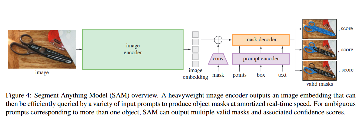 SAM 将模型拆成三部分:heavy image encoder(计算 image embedding),prompt encoder(把点/框/掩码/文本映射到向量),和轻量级 mask decoder(基于 image embedding + prompt 产生掩码)。设计目标是:灵活 prompt、实时(交互级别)、ambiguity-aware(可输出多个候选掩码)。