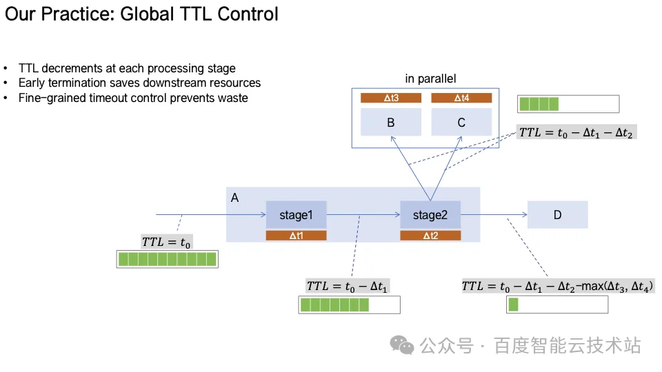 Global TTL Control(全局 TTL 控制)每个请求自入口携带生命周期 TTL,沿调用链传播并动态递减。当 TTL 耗尽时,后续请求自动终止,避免无效调用消耗宝贵计算资源。