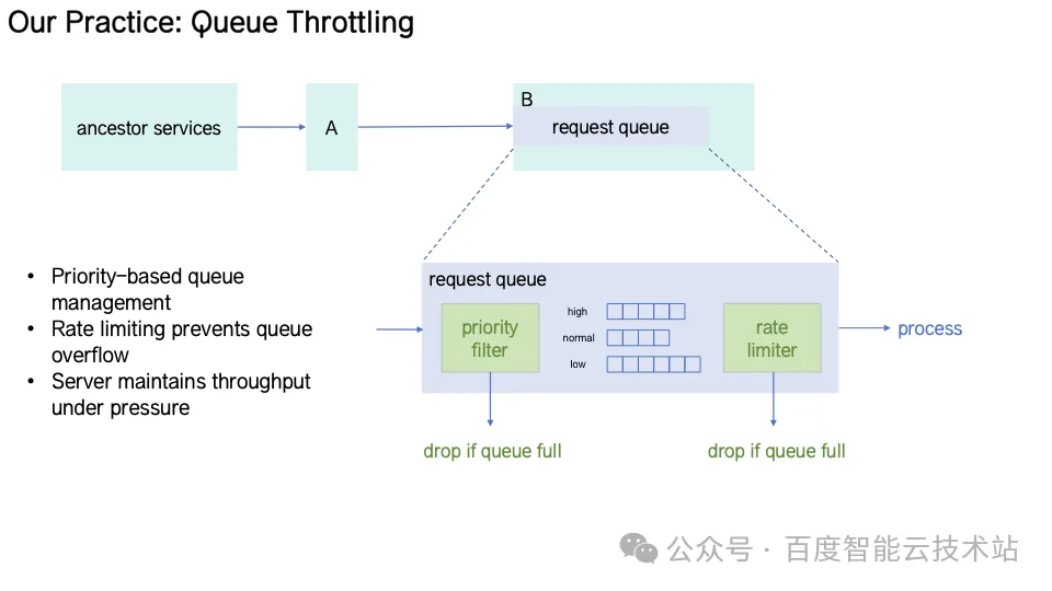 Queue Throttling(队列节流)服务端请求队列按优先级划分,拥塞时仅保留高优任务。限流器根据实时处理速率自适应调整放行,同时清除超时请求,避免队列堵塞。